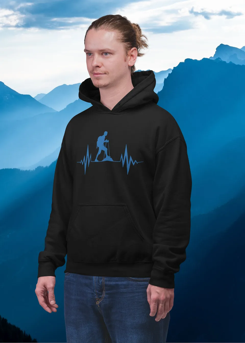 Teplá mikina s kapucí a kapsami s motivem grafu EKG a siluety turisty